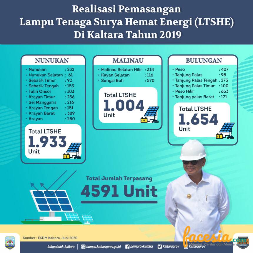 Dijelaskannya, LTSHE itu merupakan bantuan 2019 yang diusulkan Pemerintah Provinsi Kaltara kepada Pemerintah melalui Kementerian Energi dan Sumber Daya Mineral (ESDM) sesuai dari data dan usulan kabupaten. “Teknisnya usulan itu diajukan melalui aplikasi Selaras (Sistem Informasi Menajeman Penyelarasan). Dan, untuk tahun ini Pemprov Kaltara tengah mengusulkan 20.000 unit LTSHE. Namun sampai saat ini kami belum mendapatkan balasan dari pusat berapa yang disetujui, mengingat kita fokus penanganan pandemic Covid-19 ini,” ujarnya.