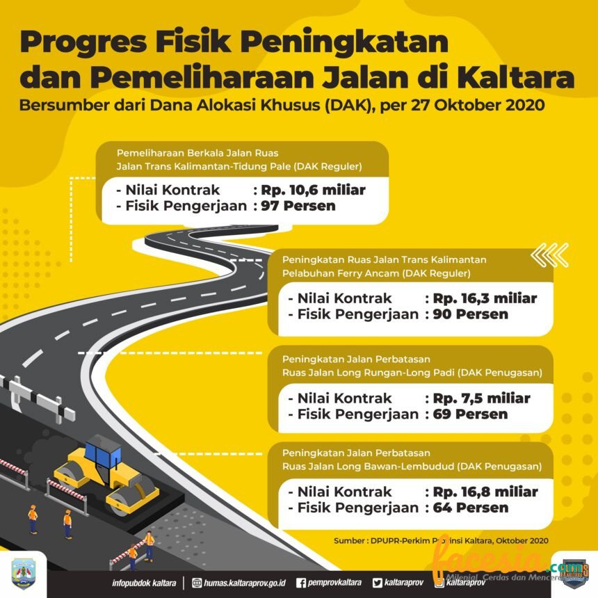 2 proyek tersebut yakni, peningkatan ruas jalan Trans Kalimantan-Pelabuhan Ferry Acam (DAK Reguler) Rp 16,3 miliar, realisasi fisik pengerjaan 90 persen. Dan, pemeliharaan berkala jalan ruas jalan Trans Kalimantan-Tidung Pale Rp 10,6 miliar dengan realisasi fisik pengerjaan 97 persen. “Kedua proyek DAK tersebut, saat ini tinggal menunggu serah terima pekerjaan akhir atau PHO (Provisional Hand Over) dan FHO (Final Hand Over) 100 persen dari kontraktor. FHO 100 persen kedua proyek ditarget pada November 2020 mendatang,” kata Kepala DPUPR-Perkim Kaltara Sunardi yang didampingi oleh Kepala Bidang (Kabid) Bina Marga, Yusran, Selasa (27/10).