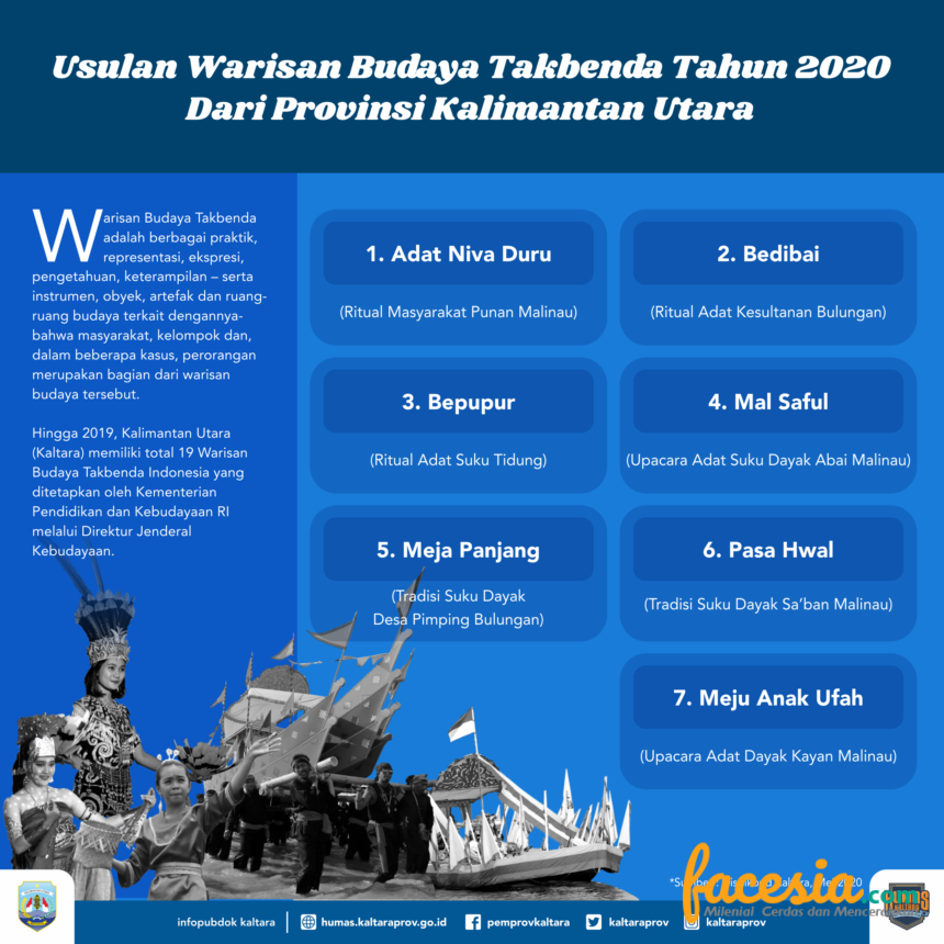 TANJUNG SELOR – Pada 2020, Pemerintah Provinsi (Pemprov) Kalimantan Utara (Kaltara) melalui Dinas Pendidikan dan Kebudayaan (Disdikbud), mengusulkan 7 warisan budaya untuk ditetapkan sebagai Warisan Budaya Tak Benda (WBTB). Adapun 7 warisan tersebut berdasarkan surat Nomor 420/1595/Disdikbud/KU/II/2020 (selengkapnya baca grafis). “Untuk tahun ini, di Kaltara ada 7 warisan budaya yang diusulan untuk ditetapkan sebagai WBTB. Dimana, saat ini usulan tersebut dalam tahap verifikasi oleh Kemendikbud,” kata pelaksana harian (Plh) kepala Disdikbud Kaltara, Firmanannur, baru-baru ini.