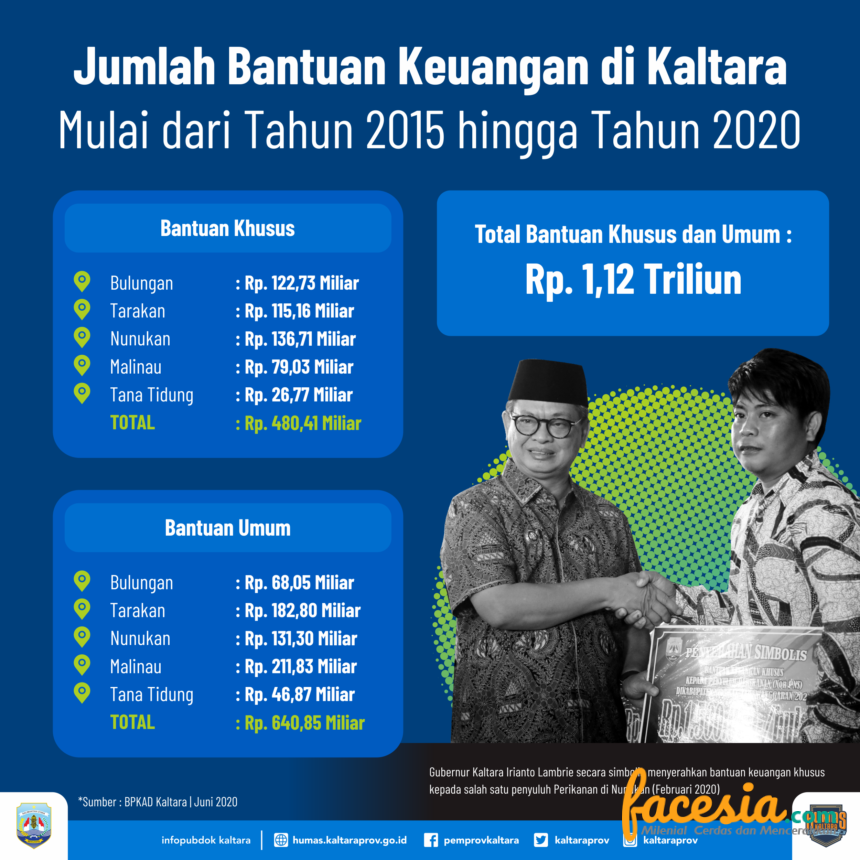 Diinformasikannya, pada 2020 melalui Anggaran Pendapatan Belanja Daerah (APBD) 2020, dialokasikan anggaran bankeu khusus Rp 60,33 miliar. Dengan rincian, Rp 18,80 miliar untuk Nunukan, Rp 16,08 miliar untuk Bulungan, Rp 8,89 miliar untuk Malinau, Rp 3,56 miliar untuk Tana Tidung dan Rp 12,99 miliar untuk Kota Tarakan. “Sebanyak 9.627 orang akan menerima bantuan keuangan dari Pemprov. Dimana, untuk tenaga pendidik dan pendidikan PNS dan Non PNS diberikan sebesar Rp 500 ribu per bulan, penyuluh pertanian dan perikanan PNS Rp 1,5 juta per bulan, dan untuk penyuluh pertanian dan perikanan Non PNS Rp 1 juta per bulan,” sebutnya.