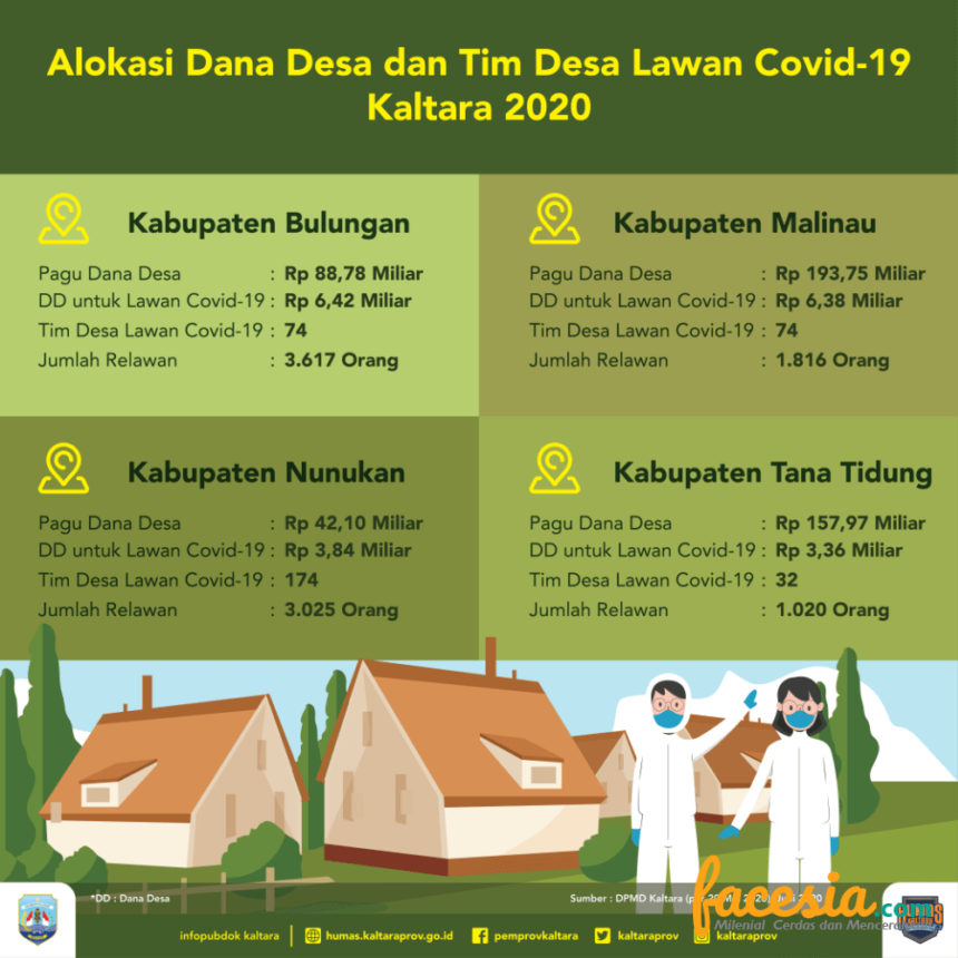 Dijelaskan kepala DPMD Kaltara H Amir Bakry, pengalokasian Dana Desa untuk lawan Covid-19 di Kaltara disesuaikan dengan Surat Edaran (SE) Menteri Desa, Pembangunan Daerah Tertinggal, dan Transmigrasi (Mendes-PDTT) Nomor 8 Tahun 2020 tentang Desa Tanggap Covid-19 dan Penegasan Padat Karya Tunai Desa. “Sejauh ini, baru sekitar 4,15 persen Dana Desa dialokasikan untuk program percepatan penanganan dan membatasi penyebaran Covid-19 di desa. Namun, ditargetkan akan terus meningkat nantinya,” kata Amir.