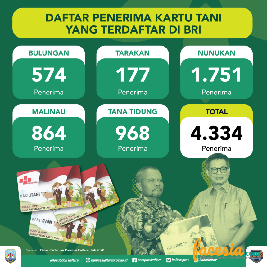 TANJUNG SELOR – Alokasi pembagian Kartu Tani di Kalimantan Utara (Kaltara) untuk tahun ini masih dalam proses penginputan data ulang oleh petugas Dinas Pertanian dan Ketahanan Pangan (DPKP) Provinsi Kaltara dan Bank Rakyat Indonesia (BRI). Diungkapkan Kepala DPKP Kaltara, Wahyuni Nuzband, saat ini tersedia 4.334 Kartu Tani yang sudah didistribusikan oleh Kementrian Pertanian ke kantor cabang (KC) BRI di setiap kabupaten/kota di Kaltara.