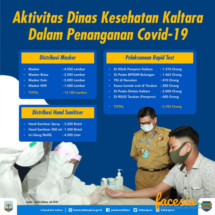 Selain itu, Dinkes Kaltara juga telah mendistribusikan 13.100 helai masker kepada warga Kaltara. Ini terdiri dari, masker biasa, masker kain dan masker N95. “Distribusinya, ada yang diserahkan langsung kepada masyarakat, melalui tokoh agama, pengurus rumah ibadah, perwakilan pemerintah desa, juga petugas kesehatan,” jelasnya.