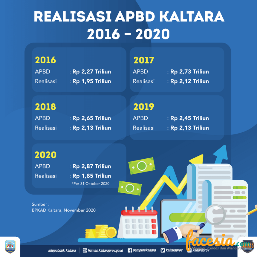 Hingga 31 Oktober 2020, data BPKAD menunjukkan, realisasi pendapatan dari target pada Anggaran Pendapatan dan Belanja Daerah (APBD) Perubahan 2020 sebesar Rp 2,533 triliun, mencapai Rp 2,166 triliun atau sekitar 85,52 persen. Sementara dari belanjanya, dari target Rp 2,877 triliun telah terealisasi hingga 64,35 persen atau sebesar Rp 1,851 triliun.