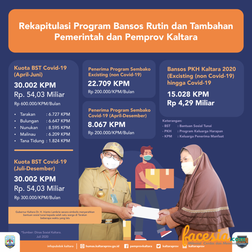 Untuk diketahui, Kemensos memberikan kuota bantuan sosial tunai (BST) sebanyak 27.000 keluarga penerima manfaat (KPM) ke Kaltara dari 9 juta KPM program ini di seluruh Tanah Air. Jaring pengaman sosial dalam rangka meminimalisir warga jatuh miskin yang terdampak karena Covid-19 ini, dinilai Gubernur sangat berarti bagi masyarakat, khususnya di Katara. Besaran BST sendiri adalah Rp 600 ribu/KPM/bulan disalurkan pada bulan April, Mei, dan Juni. Bahkan informasi terakhir diperpanjang hingga Desember 2020. “Termasuk juga perluasan program Kartu Sembako bulan April Provinsi Kaltara terhadap 4.547 KPM. Selain itu, kita juga menerima kuota 12.888 KPM bansos Program Keluarga Harapan (PKH) Tahap II sebesar Rp 11.428.300.000,” imbuhnya.
