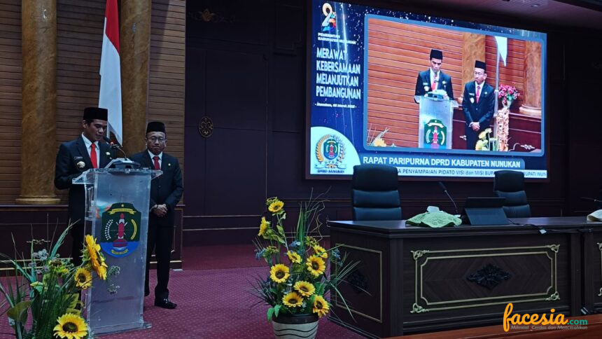 NUNUKAN – Bupati dan Wakil Bupati Nunukan H. Irwan Sabri, SE, dan Hermanus, S.Sos, menyampaikan pidato visi dan misi pemerintah daerah dalam Rapat Paripurna DPRD Nunukan, Rabu (15/3/2025) di ruang rapat paripurna.