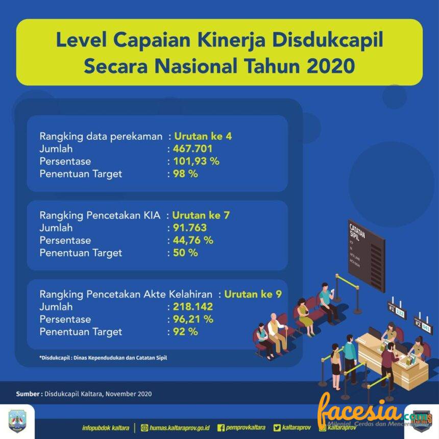 Sementara untuk pelayanan pencetakan KIA, Kaltara masuk urutan ke-7 nasional dengan jumlah pelayanan yang dilaksanakan selama 2020 sebanyak 91.763, dengan jumlah persentase 44,76 persen dari penentuan target 50 persen. Dan, untuk pelayanan pencetakan Akte Kelahiran, Kaltara berada di urutan ke-9. Dimana jumlah yang dilayani sebanyak 218.142, dengan persentase realisasi 96,21 persen dari target 92 persen.