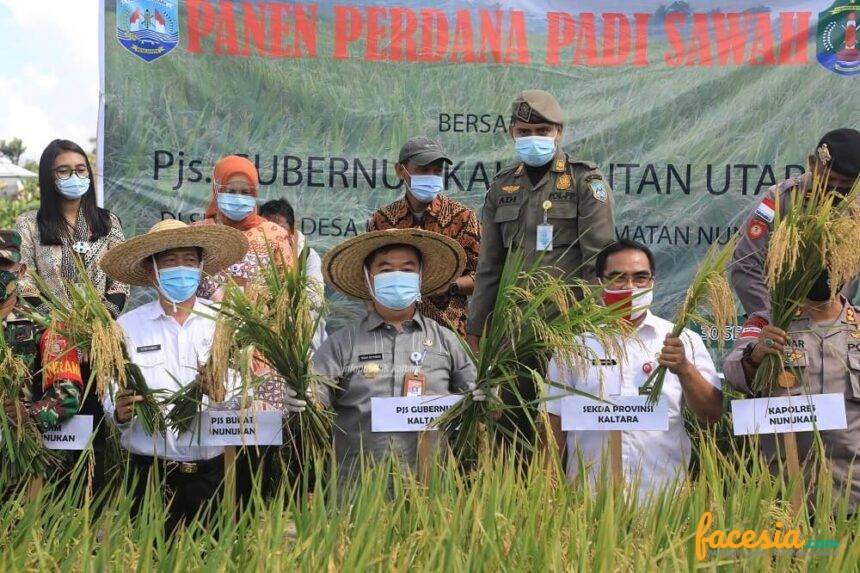 NUNUKAN – Didampingi Sekretaris Provinsi (Sekprov) Kalimantan Utara (Kaltara), Plt Bupati Nunukan Faridil Murad dan sejumlah pejabat, Pjs Gubernur Kaltara Teguh Setyabudi melakukan panen padi sawah perdana Sei Apuk Desa Ujang Patimah, Nunukan, Rabu (30/9).