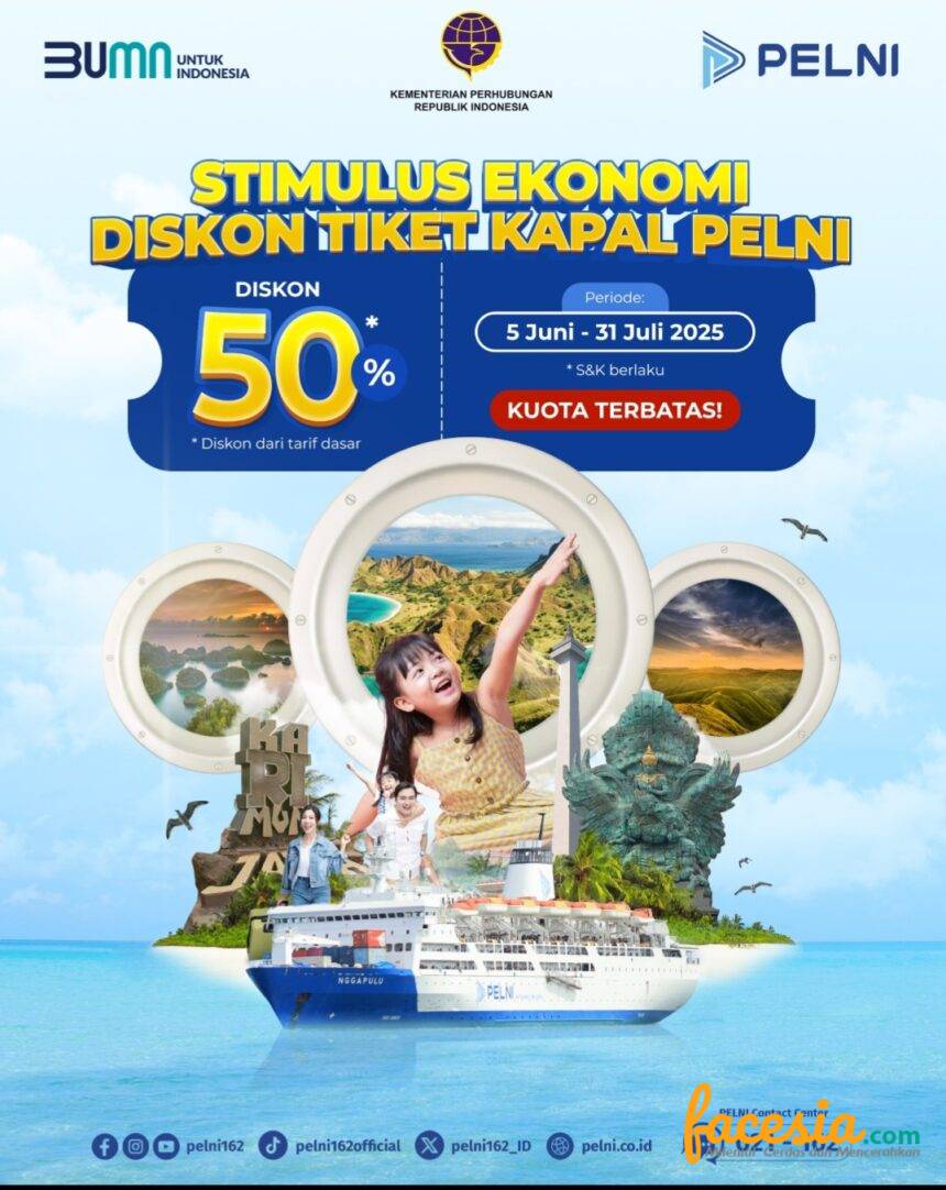 JAKARTA – PT Pelayaran Nasional Indonesia atau PT PELNI (Persero) resmi memberlakukan kebijakan stimulus ekonomi dengan memberikan diskon tiket sebesar 50% untuk pembelian tiket dan keberangkatan mulai 5 Juni 2025 sampai dengan keberangkatan 31 Juli 2025. Pemberian diskon ini sejalan dengan arahan pemerintah dalam mendukung stimulus perekonomian yang diumumkan beberapa waktu lalu.
