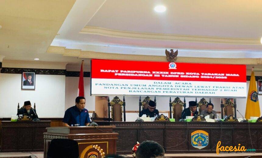TARAKAN – Fraksi Partai Kebangkitan Bangsa (FPKB) DPRD Kota Tarakan menyampaikan Pandangan Umum terhadap 2 buah rancangan peraturan daerah yakni Rencana Pembangunan Jangka Menengah (RPJMD) 2025 – 2029 Kota Tarakan dan Raperda tentang Perubahan atas Peraturan Daerah No 03 Tahun 2023 tentang Pajak Daerah dan Retrubusi Daerah, Rabu (30/7/2025).