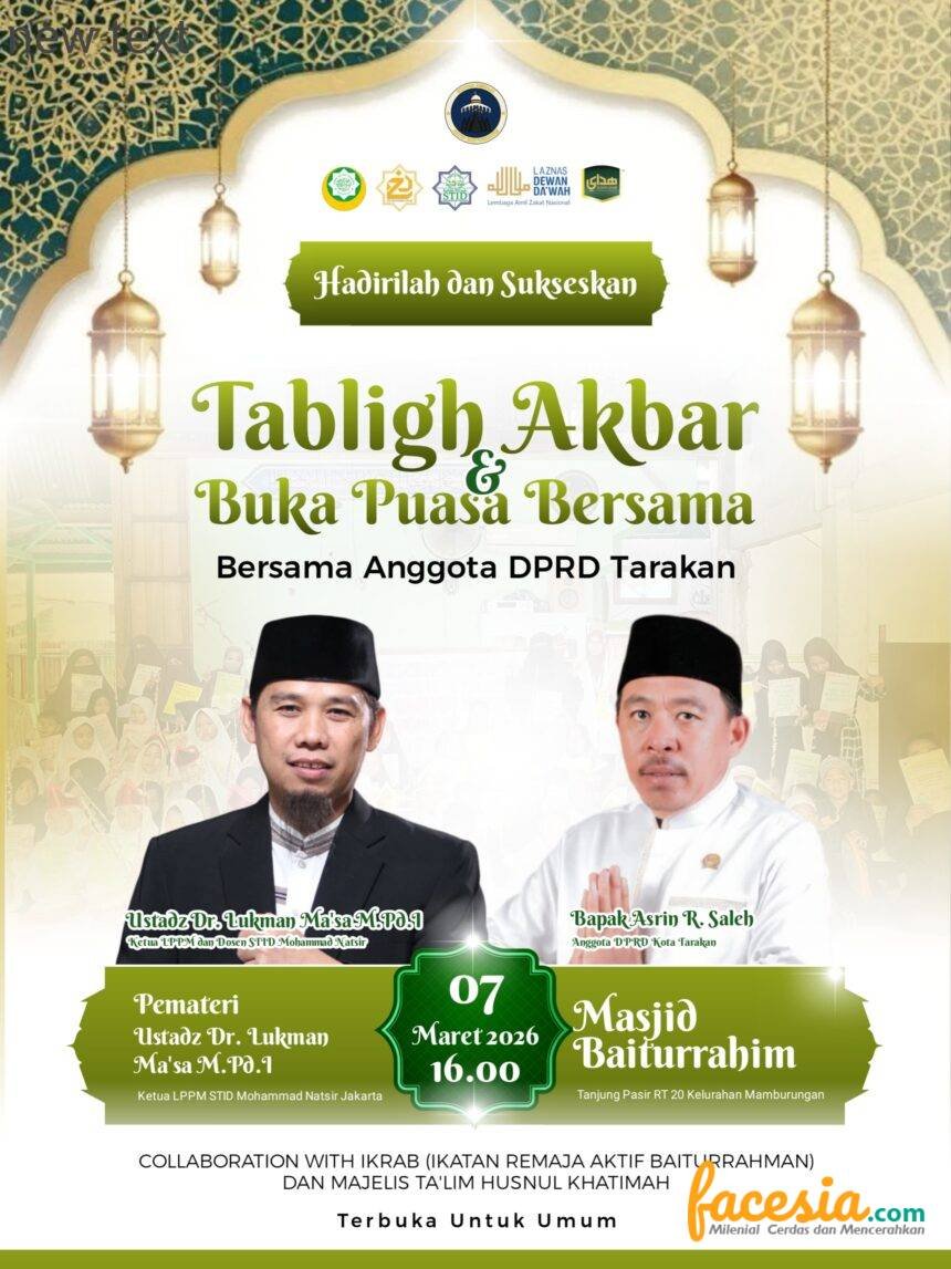 TARAKAN – Suasana khidmat bulan suci Ramadhan di Kelurahan Mamburungan, khususnya di wilayah Tanjung Pasir, dipastikan akan terasa lebih berwarna tahun ini. Anggota DPRD Kota Tarakan, Asrin R. Saleh, kembali menunjukkan kedekatannya dengan masyarakat melalui agenda Tabligh Akbar dan Buka Puasa Bersama yang direncanakan berlangsung di Masjid Baiturrahim pada Sabtu, 07 Maret 2026 mendatang.