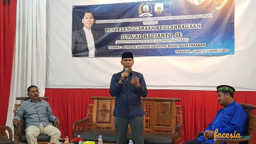TARAKAN – Anggota DPRD Provinsi Kalimantan Utara (Kaltara) dari Partai Nasdem Supa’ad Hadianto, melakukan sosialisasi Rancangan Peraturan Daerah (Raperda) tentang Penyelenggaraan Keolahragaan, di rumah makan Pondok Lesehan (Ponles), Sabtu (18/3/2023).