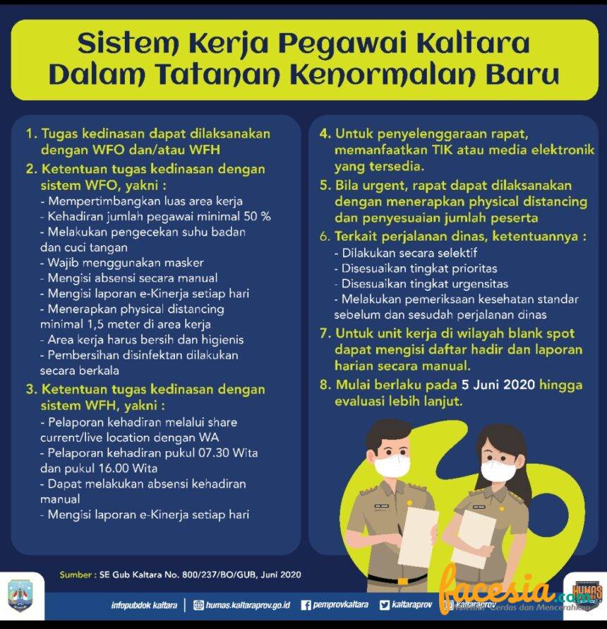 Adapun ketentuan apabila memilih sistem WFO, diantaranya pelaksanaan tugas kedinasan mempertimbangkan luas area kerja kehadiran jumlah pegawai minimal 50 persen. Lalu, diterapkan protokol kesehatan sebelum masuk ke kantor, seperti pengecekan suhu badan dan cuci tangan. “Kalau ada pegawai bersuhu badan lebih dari 37,3 derajat Celcius dalam 2 kali pemeriksaan pada jeda 5 menit, maka tidak perkenankan masuk dan diminta untuk melaksanakan pemeriksaan kesehatan dulu,” jelas Gubernur.