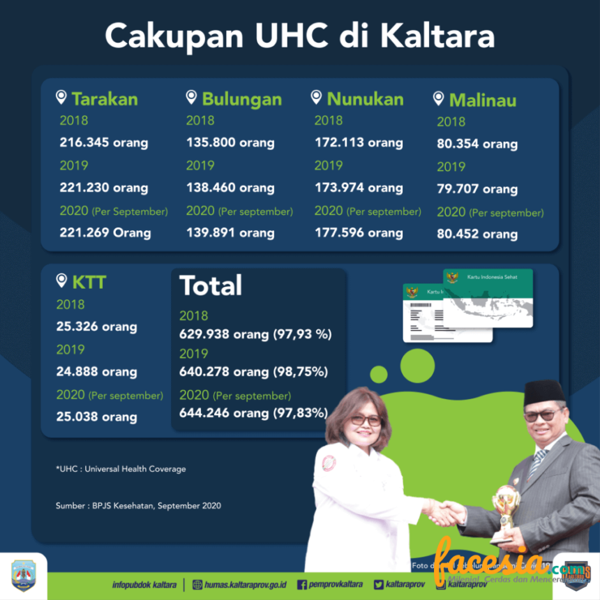 Mengacu angka tersebut, diketahui Pemprov Kaltara berhasil mempertahankan indikator Universal Health Coverage (UHC). Dimana kepesertaan masyarakat harus tercapai minimal 95 persen pada program perlindungan kesehatan.