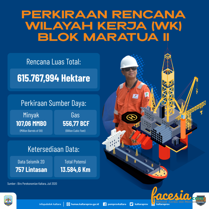 Sebagai informasi, berdasarkan data yang diperoleh Biro Perekonomian Kaltara, luas total blok Maratua II mencapai 615.767,994 hektare. Prakiraan sumber dayanya, total P50 unrisked 107,06 Million Barrels of Oil (MMBO) untuk minyak atau 556,77 Billion Cubic Feet (BCF) untuk gas.(humas)