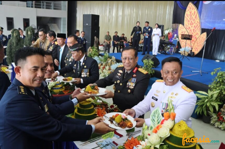 Kapolda Kaltara secara langsung menyerahkan tumpeng kepada Danlanud sebagai bentuk ucapan selamat dan penghormatan atas pengabdian TNI AU dalam menjaga kedaulatan udara nasional.