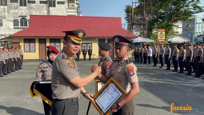 TARAKAN – Kapolres Tarakan AKBP Erwin S. Manik, S.H., S.I.K., M.H., memimpin upacara penganugerahan tanda kehormatan Satyalancana Pengabdian 32 Tahun, 24 Tahun, 16 Tahun, dan 8 Tahun, serta pemberian reward kepada personel Polres Tarakan. Kegiatan tersebut dilaksanakan pada Selasa, 27 Januari 2026, pukul 08.30 Wita, bertempat di Lapangan Apel Mako Polres Tarakan.