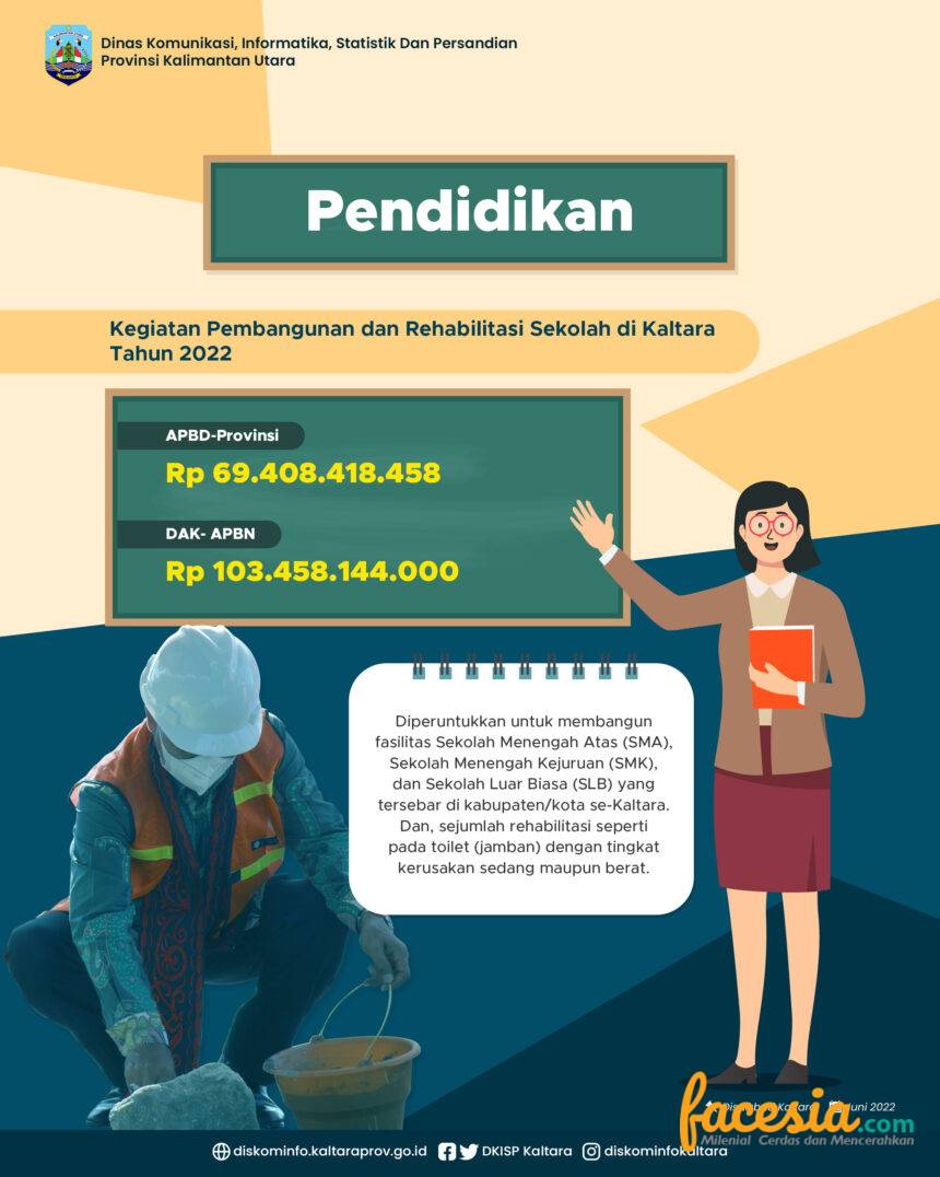 Kepala Dinas Pendidikan dan Kebudayaan (Disdikbud) Kaltara, Drs Teguh Henri Susanto, M.Pd melalui Sekretarisnya H Sudarsono mengungkapkan, selain melalui APBD Provinsi, pembangunan sekolah di Kaltara juga ditopang melalui Dana Alokasi Khusus (DAK) dari Anggaran Pendapatan dan Belanja Negara (APBN), nilainya Rp 103 miliar lebih.