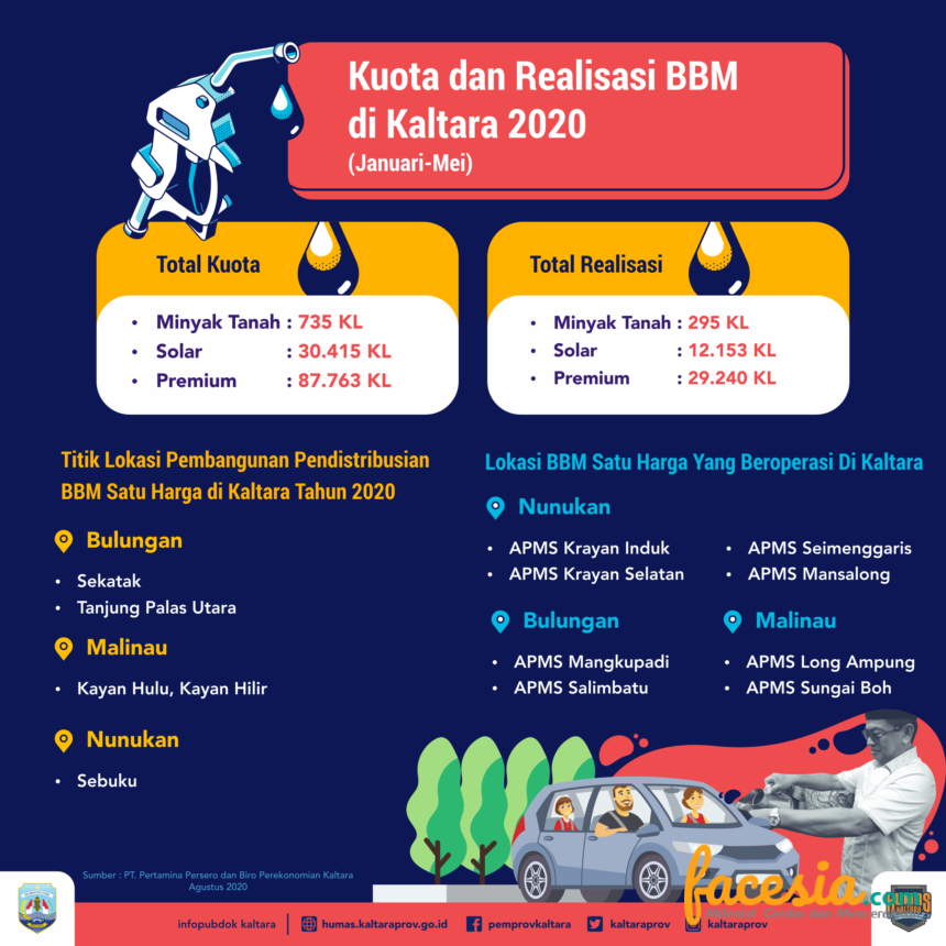 Adapun kuota BBM Kaltara pada tahun ini, sebesar 118.913 Kilo Liter (KL). Dimana, kuota untuk Jenis BBM Tertentu (JBT) Solar sebanyak 30.415 KL , Kerosene 735 KL, dan untuk Jenis BBM Khusus Penugasan (JBKP) 87.763 KL. “Realisasi dari Januari hingga Mei lalu, mencapai 41.688 KL. Yakni, realiasi JBT Solar 12.448 KL dan JBKP 29.240 KL,” ujarnya.