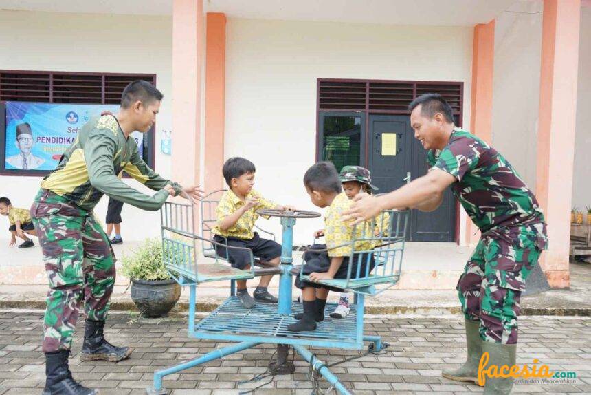 Seperti yang tertangkap kamera Penerangan Kodim 0907/Tarakan, nampak personel Satgas TMMD menyempatkan diri untuk bermain bersama anak-anak TK Pantai Amal disaat mereka melaksanakan istirahat, Sabtu (20/05/2023).