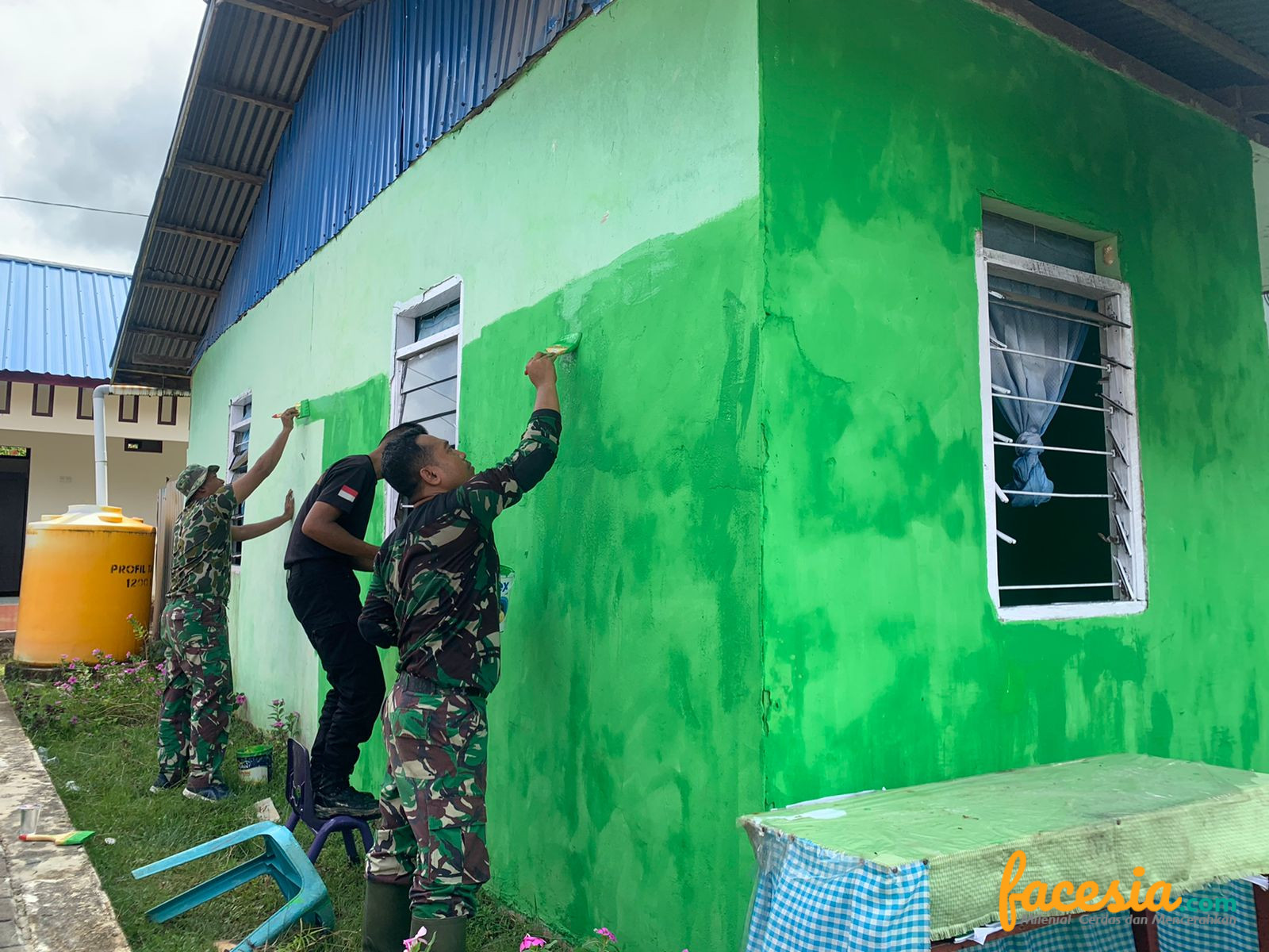 Seperti yang terlihat personel Satgas TMMD dengan cekatan melakukan pengecatan dinding Posyandu Matta Alo di wilayah RT 03 Kelurahan Pantai Amal Kecamatan Tarakan Timur, Kota Tarakan Prov Kaltara, Senin(15/05/2023).