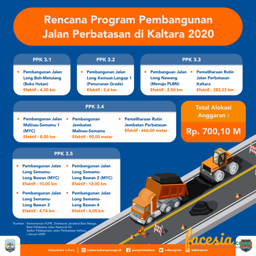 Sesuai informasi dari Balai Pelaksana Jalan Nasional (BPJN) XII, Satuan Kerja (Satker) Pelaksanaan Jalan Perbatasan (PJP) Provinsi Kaltara kata Gubernur, juga untuk pembangunan jalan Long Nawang menuju Pos Lintas Batas Negara (PLBN) panjang efektif 2,50 kilometer. Lalu, pemeliharaan rutin jalan perbatasan dengan panjang efektif 283,33 kilometer. Dan, pembangunan jalan Malinau-Semamu 1 yang merupakan proyek multiyears, dan pemeliharaan rutin jembatan perbatasan. “Adapula pembangunan jalan Long Semamu-Long Bawan, pembanguan jalan Long Semamu-Long Bawan. Dengan total panjang efektif 30,74 Km,” ungkap Gubernur.