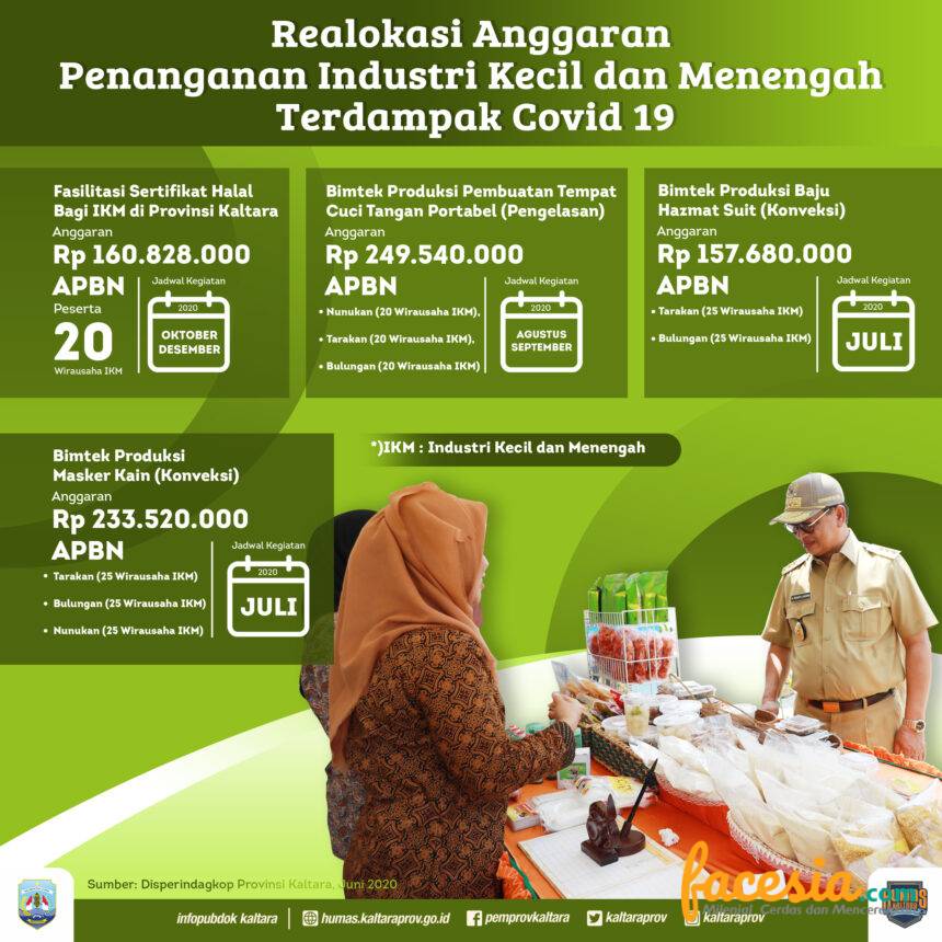 “Disperindagkop-UMKM sudah melakukan realokasi anggaran bagi pelaku IKM yang terdampak Covid-19, antara lain akan digunakan untuk menumbuhkan dan mengembangkan wirausaha baru (WUB) IKM pada daerah terdampak COVID-19 di Kaltara,” kata Gubernur Kaltara, Dr H Irianto Lambrie yang didampingi Kepala Disperindagkop-UMKM Kaltara, Hartono baru-baru ini.