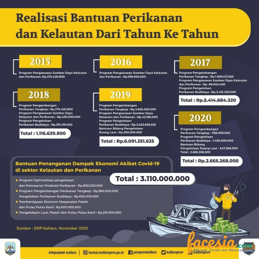 Pada 2017 nilai bantuannya naik, dengan alokasi Rp 5.414.684.320 yang disalurkan nelayan se Kaltara. Ini juga diperuntukan pengembangan perikanan tangkap sebesar Rp 1.909.513.920. Kemudian pengawasan sumber daya kelautan dan perikanan Rp 89.940.400 dan pengelolaan perikanan budidaya sebesar Rp 3.415.230.000. Sementara pada 2018, bantuan kembali dikucurkan sebesar Rp 1.116.639.800.