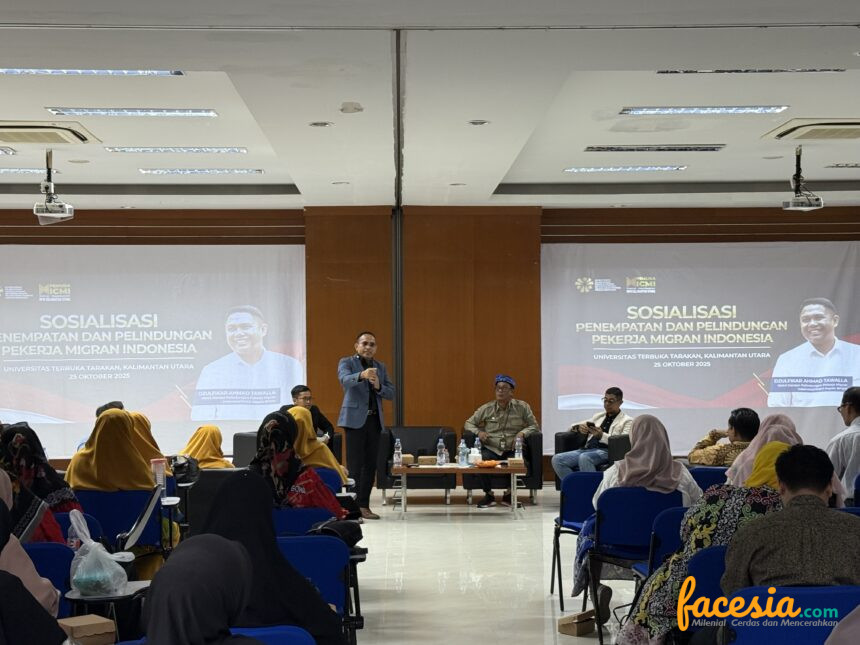 TARAKAN – Pemuda Ikatan Cendekiawan Muslim Indonesia (ICMI) Kalimantan Utara (Kaltara) menyelenggarakan sosialisasi mengenai kebijakan perlindungan Pekerja Migran Indonesia (PMI) yang berfokus pada kawasan perbatasan negara atau daerah transit. Kegiatan ini, bertema “Kebijakan Perlindungan Pekerja Migran Indonesia yang Sesuai untuk Diterapkan di Kawasan Perbatasan Negara atau Daerah Transit,” dihelat pada Sabtu, 25 Oktober 2025, di Gedung Lantai 2 Universitas Terbuka (UT) Tarakan.