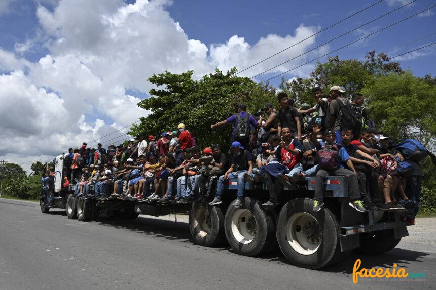 PERBATASAN : Migran Honduras, bagian dari karavan yang menuju ke AS, terlihat di atas truk di Entre Rios, Guatemala. Mereka melintasi perbatasan dari Honduras, pada 1 Oktober 2020. Sebuah karavan baru sebanyak 5.000 orang, meninggalkan San Pedro Sula, di tengah pandemi virus corona. //Johan ORDONEZ/AFP//