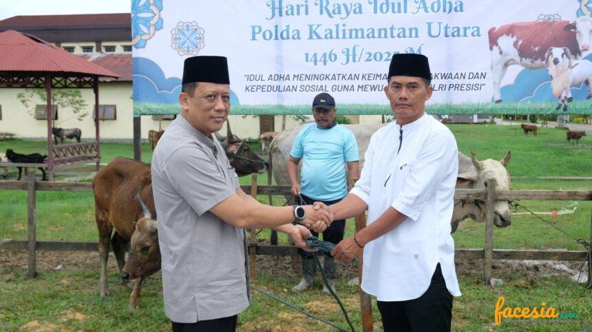 BULUNGAN – Kepolisian Daerah Kalimantan Utara melaksanakan pemotongan hewan kurban usai pelaksanaan salat Idul Adha 1446 H / 2025 M di halaman Masjid Nur Aryaguna Mapolda Kaltara, Jumat (6/6/2025).