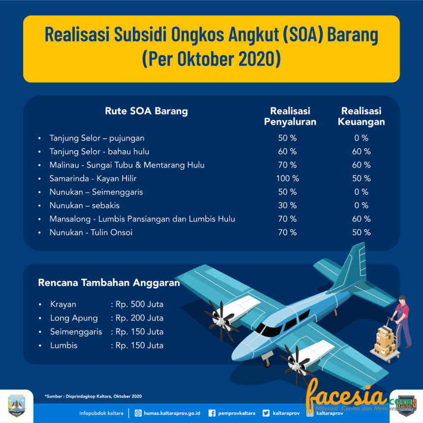 Hartono menyatakan, hingga Oktober ini terdapat 1 titik penyaluran SOA barang yang sudah mencapai 100 persen, dan terdapat 3 titik yang sudah mencapai 70 persen. “Rute dari Samarinda ke Kayan Hilir pada bulan ini penyaluran SOA barang sudah mencapai 100 persen. Sedangkan 3 titik yang sudah mencapai 70 persen itu pada rute Mansalong ke Lumbis Pansiangan dan Lumbis Hulu, rute Nunukan Tulin Onsoi. Kemudian rute Malinau – Sungai Tubu dan Mentarang Hulu, ”ungkapnya.