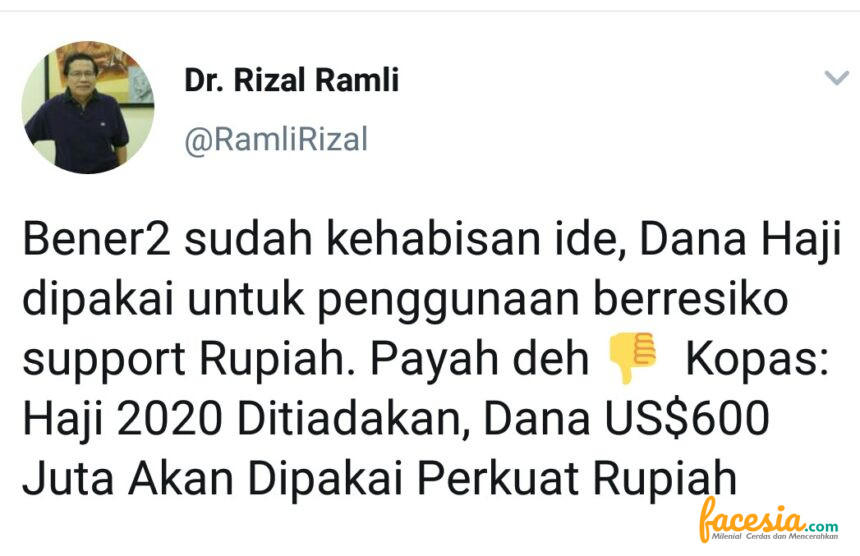 Ia mengatakan rencana pemerintah dalam penggunaan dana haji untuk mendukung Rupiah merupakan risiko besar. “Bener-bener sudah kehabisan ide, dana Haji dipakai untuk penggunaan berisiko support Rupiah. Payah deh,” ucap Rizal Ramli lewat akun Twitter-nya @RamliRizal, Selasa (2/6/2020).