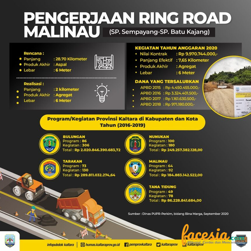 Gubernur Kalimantan Utara (Kaltara) Dr H Irianto Lambrie menuturkan pembangunan Ring Road Malinau (SP Sempayang-SP Batu Kajang) dikerjakan secara bertahap sejak 2015. Di mana, realisasi saat ini sepanjang 2 kilometer berkondisi agregat.