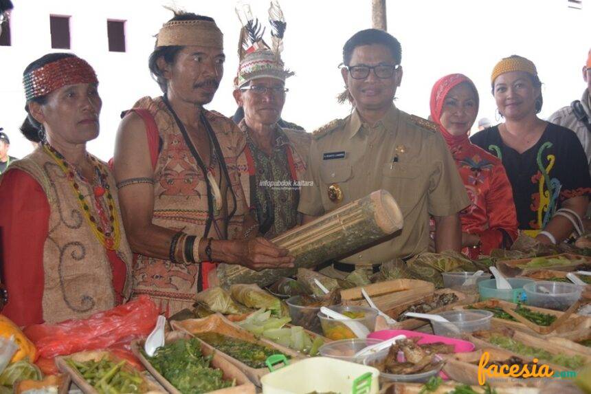 POTENSI : Gubernur Kaltara, Dr H Irianto Lambrie berfoto bersama masyarakat adat dan beragam penganan tradisional yang dibuat dari sayur dan rempah-rempah endemis Kaltara. Foto diabadikan Agustus 2014.