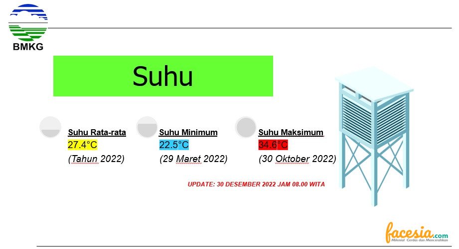 Kemudian untuk temperature atau suhu udara rata-rata di Tarakan tahun 2022, di angka 27,4 derajat celsius dan minimum di angka 22,5 derajat Celsius pada 29 Maret 2022.