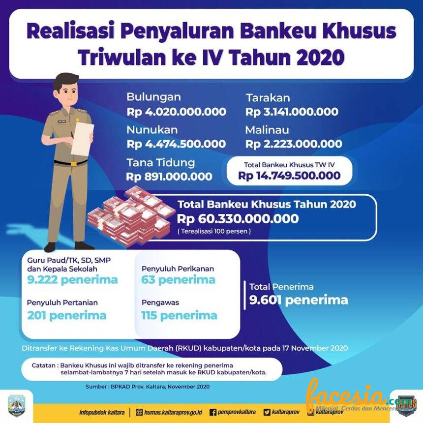 TANJUNG SELOR – Kabar gembira bagi tenaga pendidik, kependidikan beserta penyuluh yang ada di kabupaten/kota. Pasalnya, per 17 November 2020, Pemerintah Provinsi (Pemprov) Kalimantan Utara (Kaltara) telah menyalurkan Bantuan Keuangan (Bankeu) Khusus ke Rekening Umum Kas Daerah (RKUD) kabupaten/kota guna pencairan insentif tenaga pendidik beserta penyuluh triwulan (TW) IV.