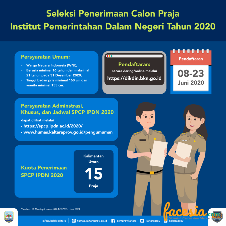 TANJUNG SELOR – Tahun ini, Kalimantan Utara (Kaltara) kembali mendapatkan jatah sebanyak 15 orang untuk menempuh pendidikan di Institut Pemerintahan Dalam Negeri (IPDN). Hal itu berdasarkan Surat Menteri Pendayagunaan Aparatur Negara dan Reformasi Birokrasi (Menpan-RB) Nomor B/435/M.SM.01.00/2020 tanggal 6 Mei 2020, dan pengumuman Menteri Dalam Negeri (Mendagri) Nomor 810/684/IPDN tanggal 1 Juni 2020.