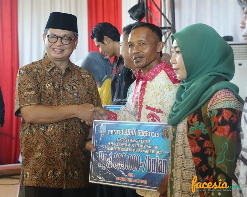 BANTUAN KEUANGAN : Gubernur Kaltara, Dr H Irianto Lambrie saat menyerahkan secara simbolis Bankeu Khusus untuk Penyuluh Pertanian Non PNS TA 2020, baru-baru ini. Humas Provinsi Kaltara