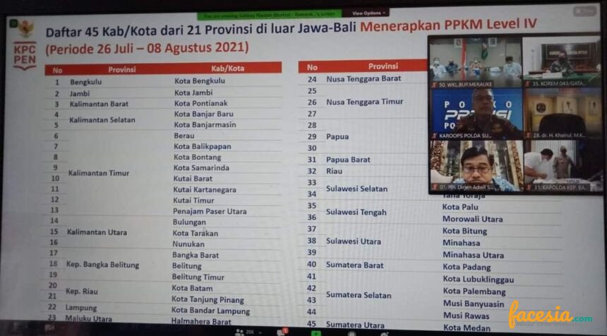 Penerapan PPKM level IV menunjukkan sebanyak 45 kabupaten/kota dari 21 provinsi di Indonesia yang masuk dalam daftar pemberlakukan tersebut.  Pemberlakuan PPKM Level IV akan dilaksanakan mulai dari tanggal 25 Juli sampai 8 Agustus 2021.