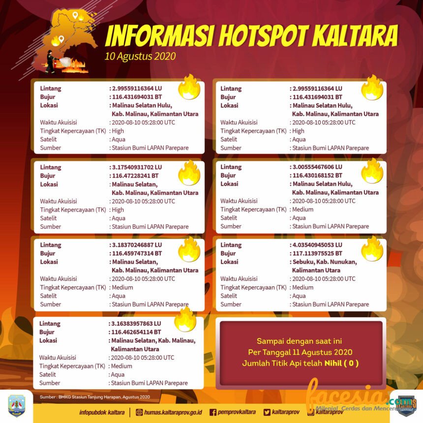 Per 10 Agustus 2020, tercatat ada 7 titik panas di Kaltara yang terpantau satelit. Enam titik panas terpantau di Malinau dan satu titik terpantau di Nunukan. Beruntung, per 11 Agustus, tidak adalagi titik panas yang terpantau.(humas)