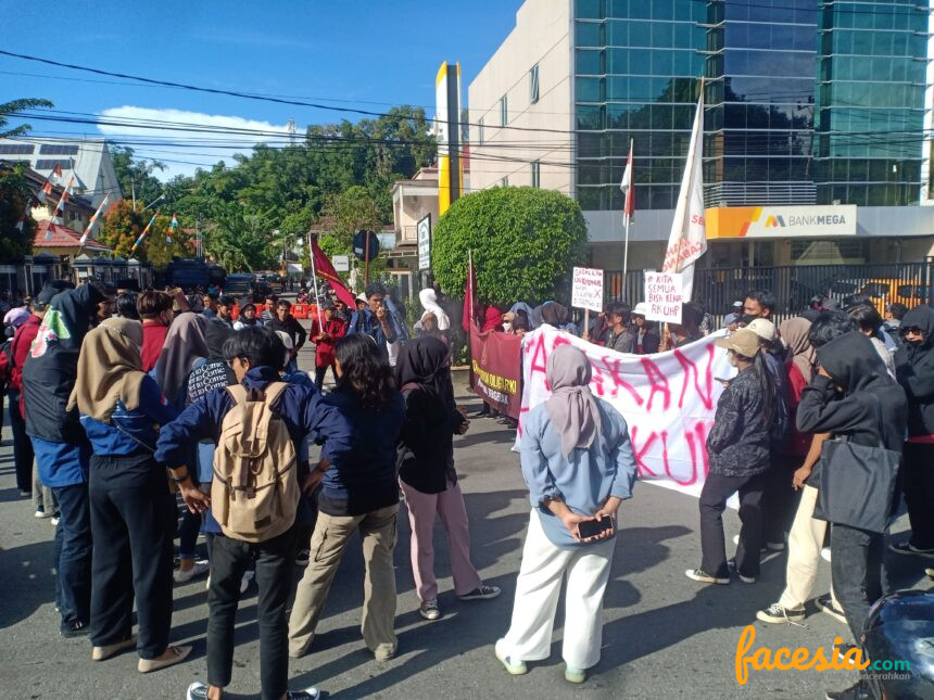 TARAKAN – Puluhan mahasiswa menggelar aksi demo di depan kantor Dewan Perwakilan Rakyat Daerah (DPRD) Kota Tarakan, Jumat (9/12/2022).