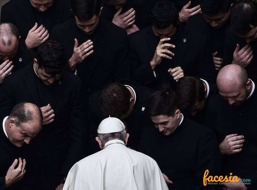 KESEHATAN : Paus Fransiskus berdoa bersama para imam di akhir audiensi publik terbatas di halaman San Damaso di Vatikan pada 30 September 2020 selama infeksi COVID-19, yang disebabkan oleh virus korona baru. //Filippo Monteforte/AFP//
